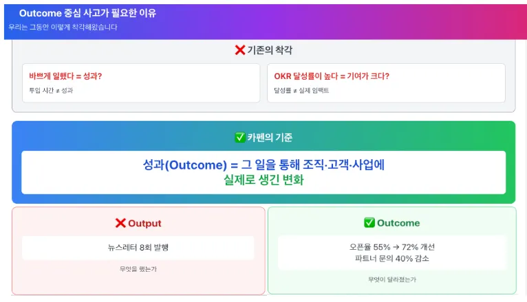 카펜도 같은 시행착오를 겪었습니다. 처음에는 OKR 달성률을 성과처럼 다뤘고,그 결과는 분명했습니다. 도전적인 목표를 피하게 되었고, 시도보다 숫자설명이 중요해졌으며,지원 조직과 R&D는 성과 설명이 점점 어려워졌습니다.