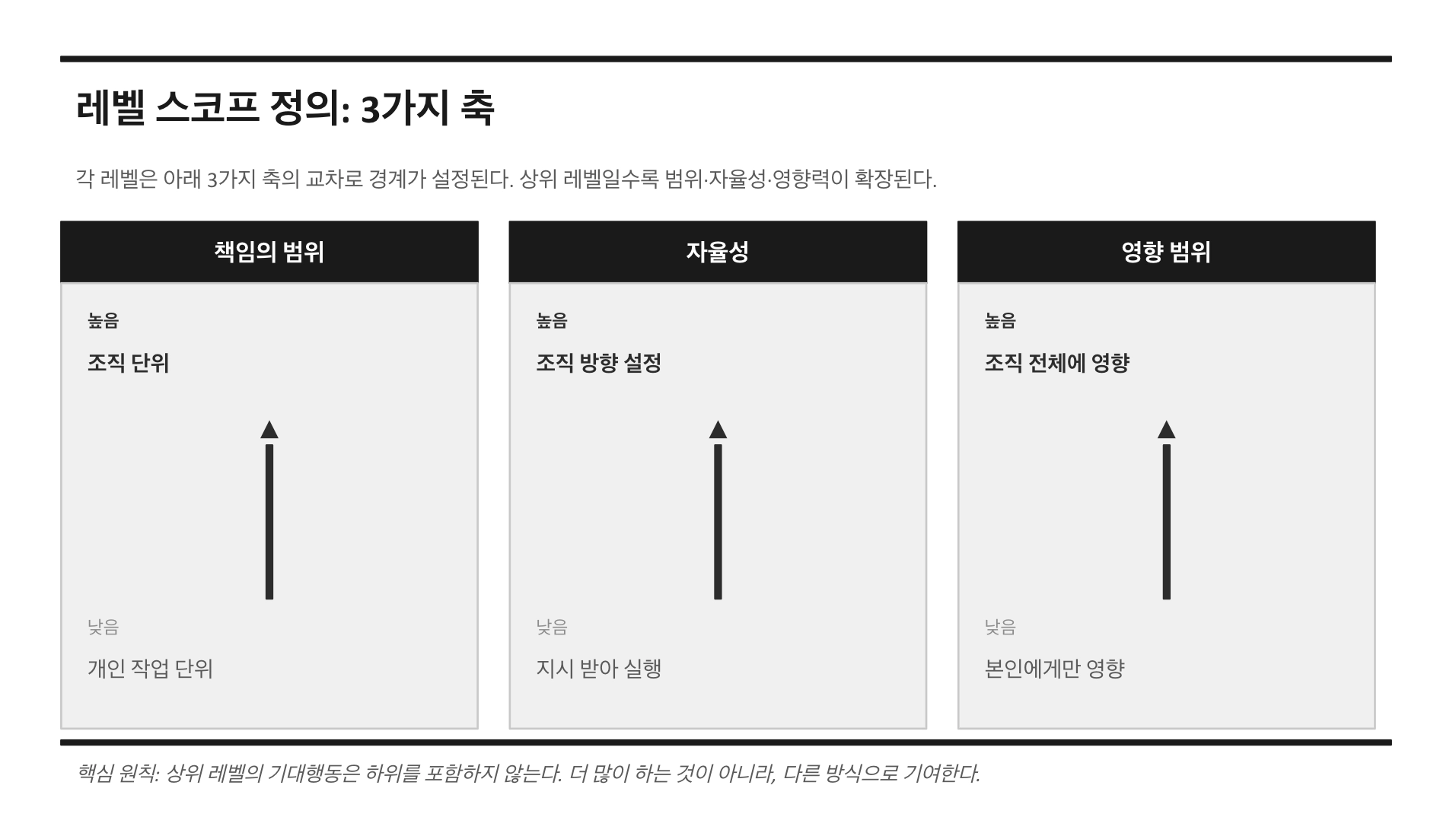 책임의 범위 | 개인 작업 단위 → 프로젝트 → 팀 → 조직 단위 |