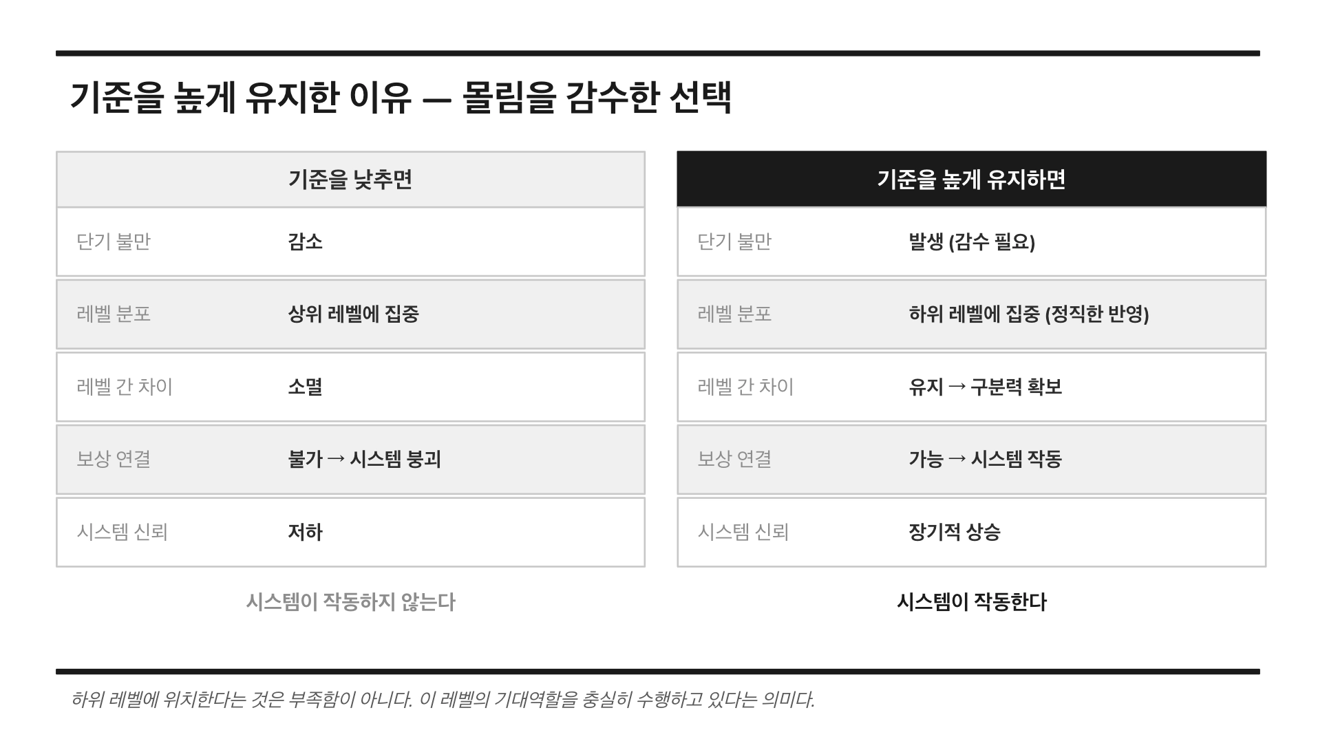 기준을 높게 유지하면 정직한 분포 → 레벨 간 차이 명확 → 보상 근거 생김