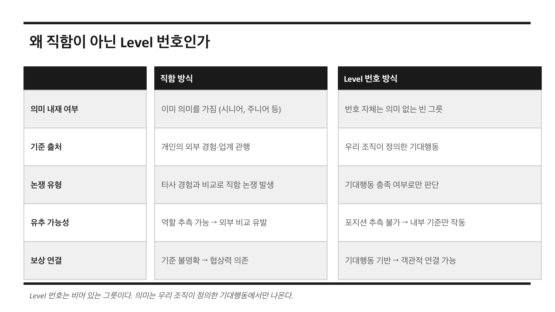 Level 번호는 그 자체로 아무 의미가 없습니다. 의미는 기대행동 정의에서 나옵니다. 레벨 번호는 비어 있는 그릇입니다. 그 그릇에 우리 조직이 정의한 스코프와 책임을 담기 때문에, 외부 경험과 비교되지 않고 우리 기준에서만 이야기할 수 있습니다.