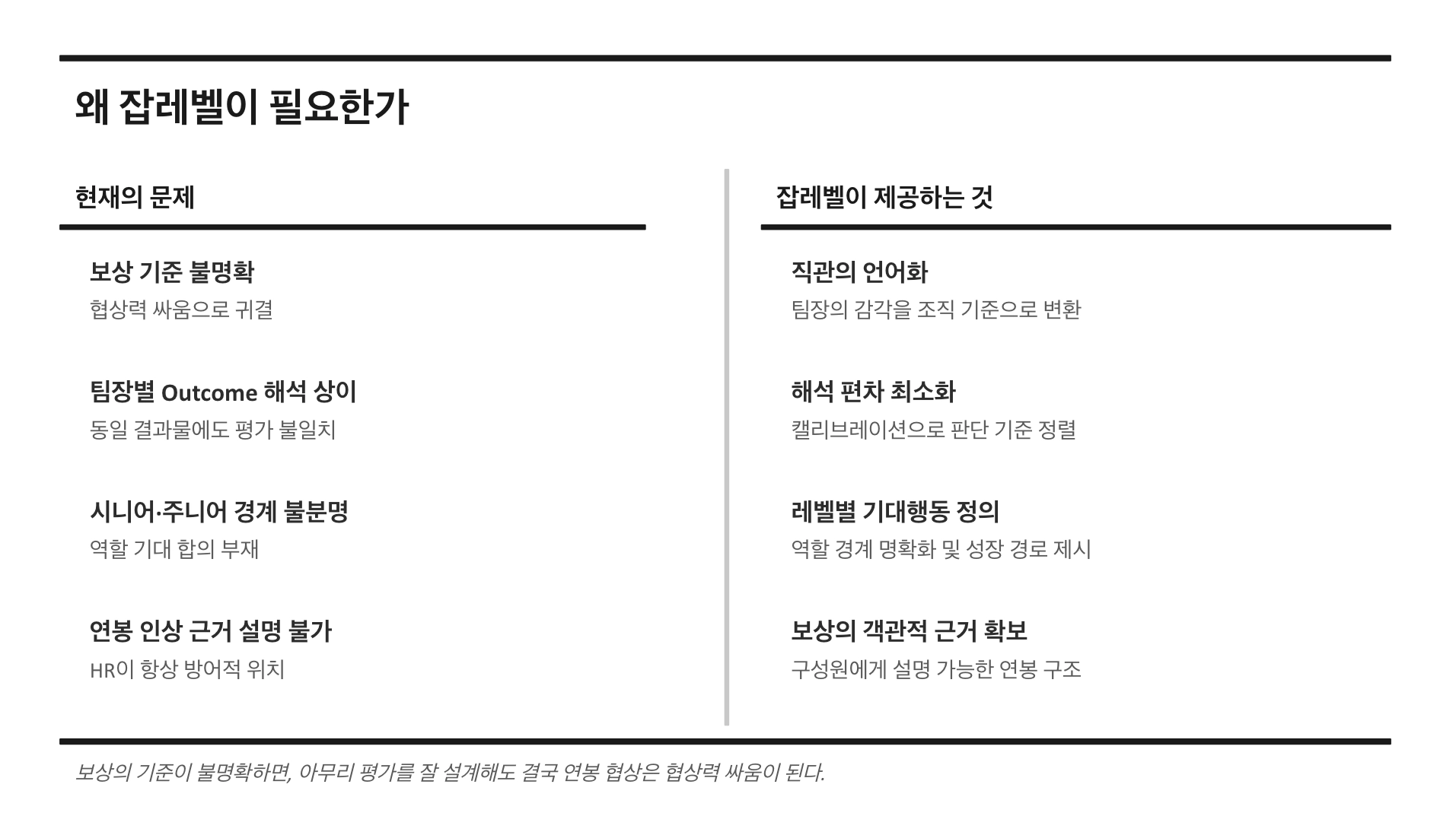 감각으로는 알 수 있습니다. 오래 함께 일한 팀장이라면 직관적으로 압니다. 하지만 그 감각을 다른 팀장과 공유할 수 없고, 구성원에게 설명할 수 없고, 보상의 근거로 제시할 수 없다면, 그 감각은 조직의 자산이 되지 못합니다. 잡레벨은 그 감각을 언어로 만드는 작업으로 직관을 기준으로 바꾸는 일입니다.